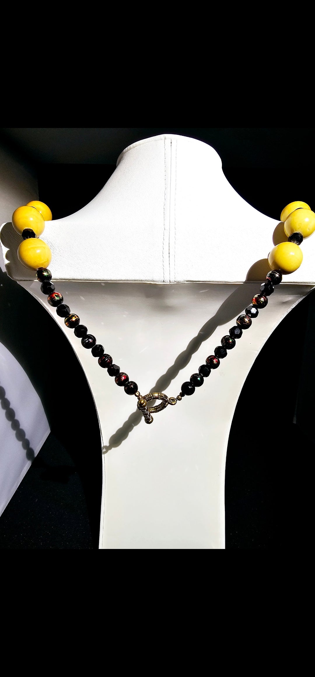 This incredible necklace has 14mm mustard yellow ceramic round beads, 8mm multi-colored glass beads with a black base, and 8mm black faceted crystal beads. The woven design antique gold toggle clasp pulls it all together.